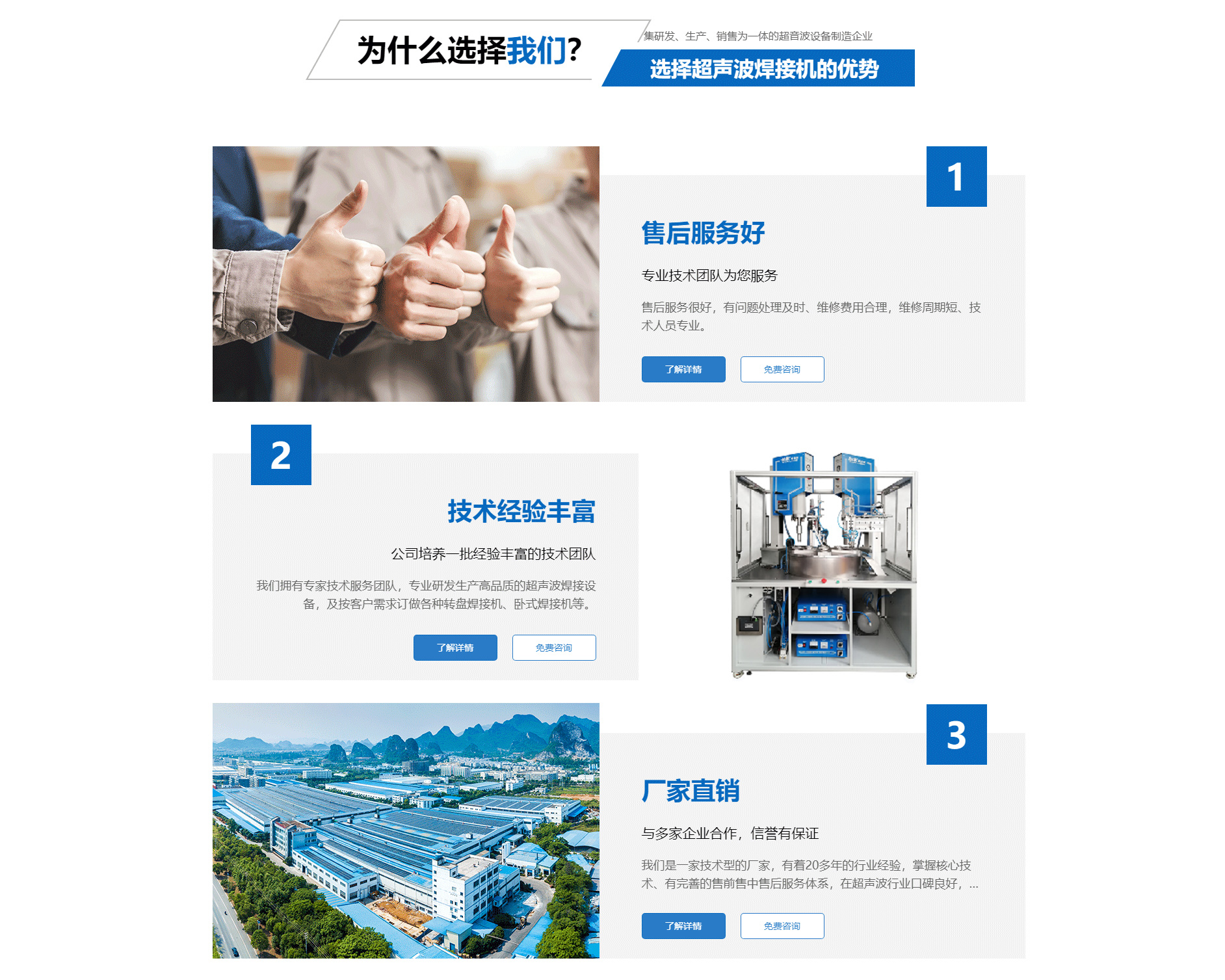 廈門勁榮機(jī)械設(shè)備有限公司是一家集研發(fā)、生產(chǎn)、銷售為一體的超音波設(shè)備制造企業(yè),主要產(chǎn)品包括多規(guī)格型號(hào)的超音波塑膠熔接機(jī)、熱板式塑料焊接機(jī)、多工位轉(zhuǎn)盤焊接機(jī)、振動(dòng)摩擦焊接機(jī)、旋轉(zhuǎn)式塑膠熔接機(jī)及配套的工裝夾具等。公司自2003年成立以來(lái),一直致力于產(chǎn)品不斷完善中,并追求產(chǎn)品的精益求精,于2004年向國(guó)家商標(biāo)局注冊(cè)了“勁榮”牌商標(biāo),2009年榮獲廈門市商標(biāo)。 經(jīng)過(guò)多年的努力,公司已經(jīng)發(fā)展成為占地面積2000余平方米、擁有員工50余人的企業(yè)。公司一直將“品質(zhì)是企業(yè)發(fā)展的原動(dòng)力”作為經(jīng)營(yíng)理念,嚴(yán)把質(zhì)量關(guān),建立了一整套有效的安全生產(chǎn)及管理模式,不僅贏得了同行的認(rèn)可,更取得了客戶的信賴,先后與九牧集團(tuán)、路達(dá)工業(yè)、建霖集團(tuán)、西伯電子、蒙發(fā)利實(shí)業(yè)、松霖科技、銥科集團(tuán)、科司特電子等公司建立了長(zhǎng)期的合作關(guān)系。 面對(duì)已經(jīng)取得的成績(jī),我們不驕不滿,因?yàn)樯钪獦I(yè)績(jī)只能代表過(guò)去,只有靠良好的產(chǎn)品質(zhì)量和完善的售后服務(wù)才能在客戶中口碑相傳,在...